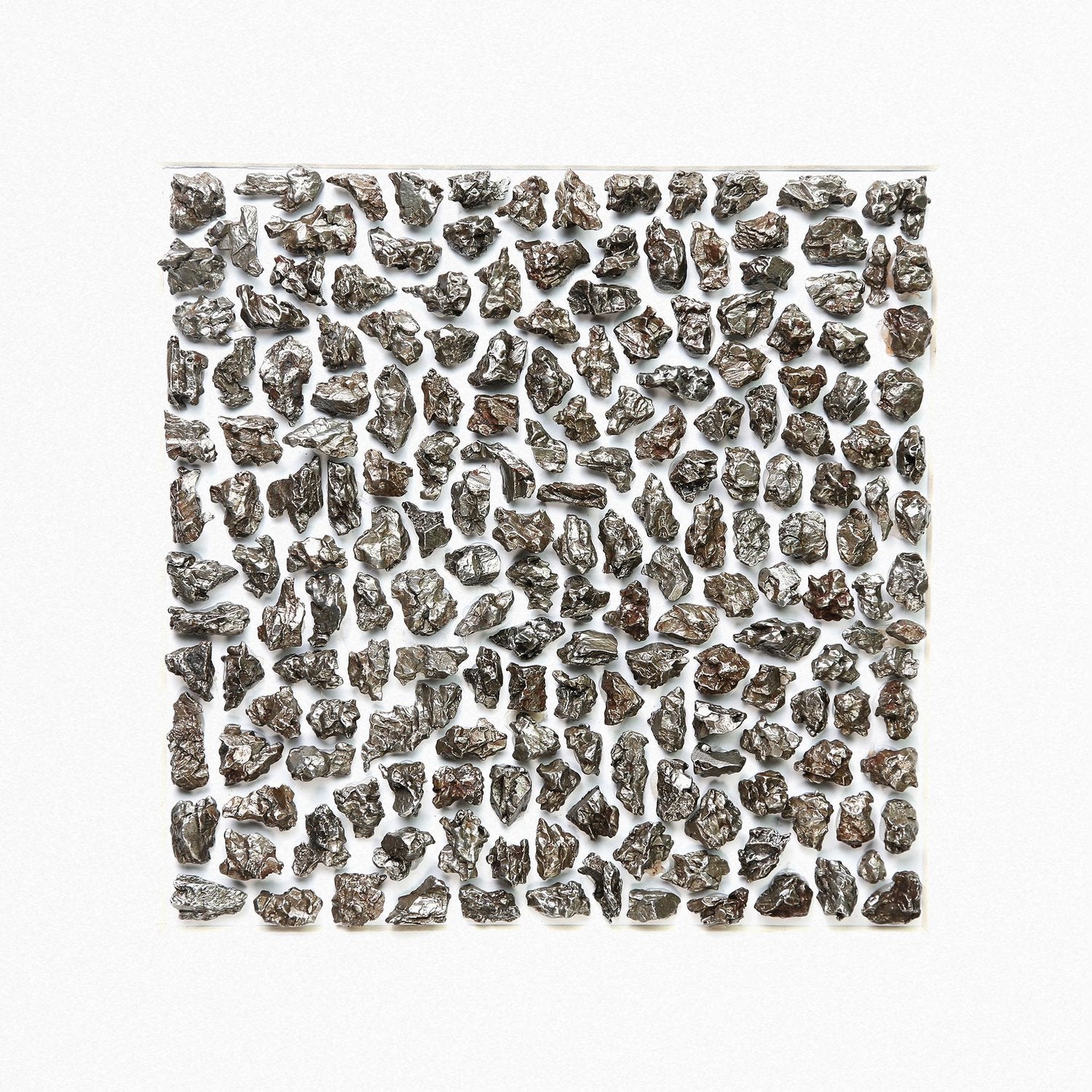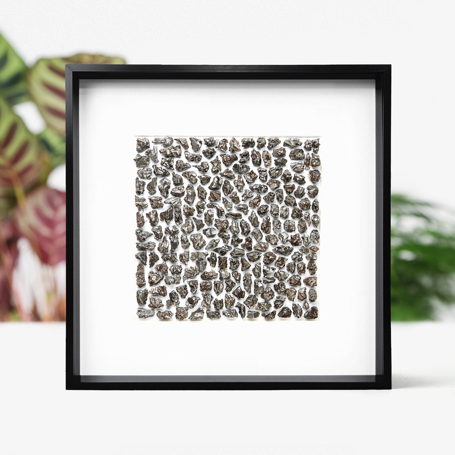 This composition of Campo del Cielo fragments has been carefully selected for its well-preserved surfaces and natural features, culminating into a mosaic displayed in a museum quality deep box frame.