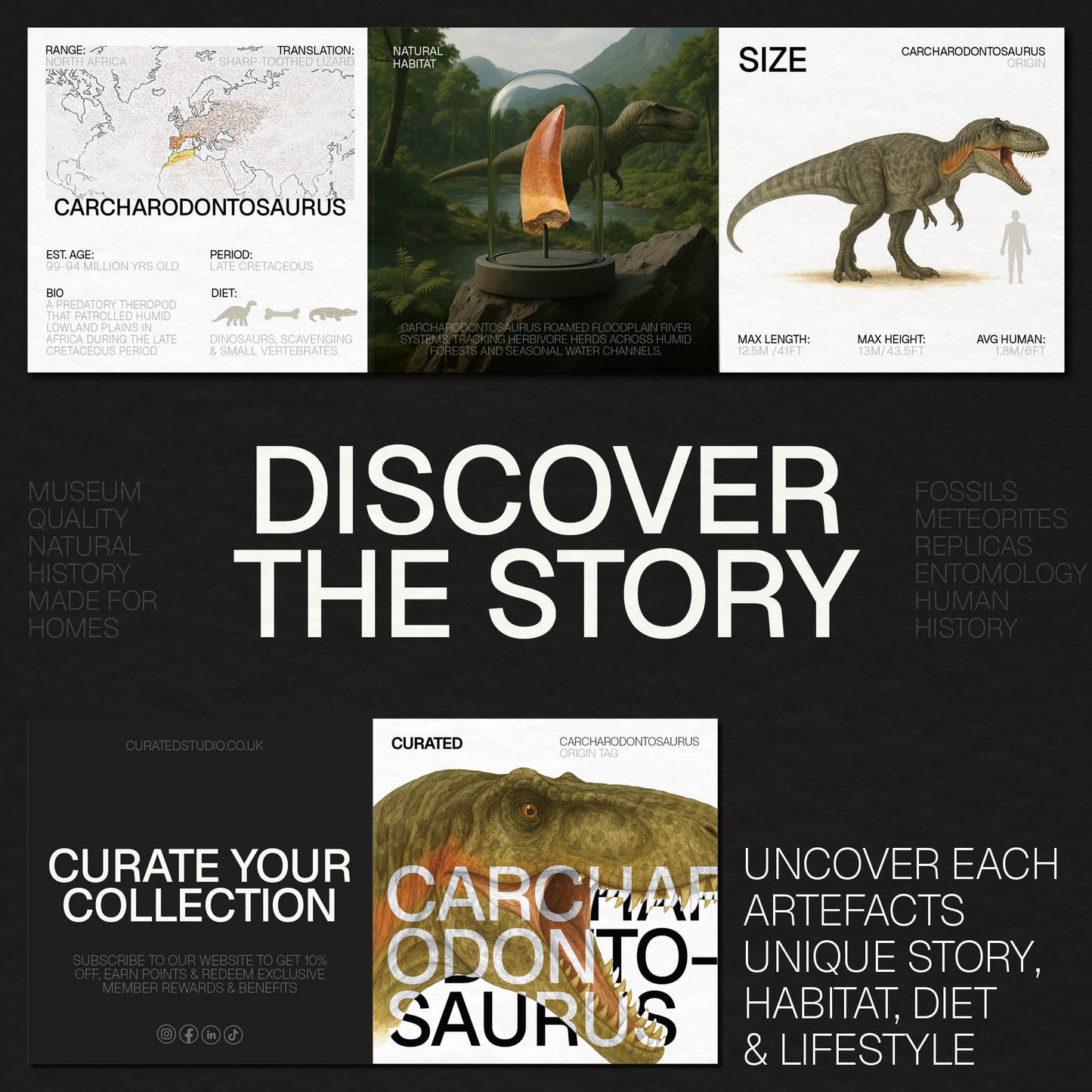This fossilised tooth belonged to Carcharodontosaurus and has been displayed in a museum quality deep box frame, complete with a scientifically accurate, hand-drawn illustration. The creature is one of the largest known predatory dinosaurs dating to the mid-Cretaceous period, approximately 95 million years ago.