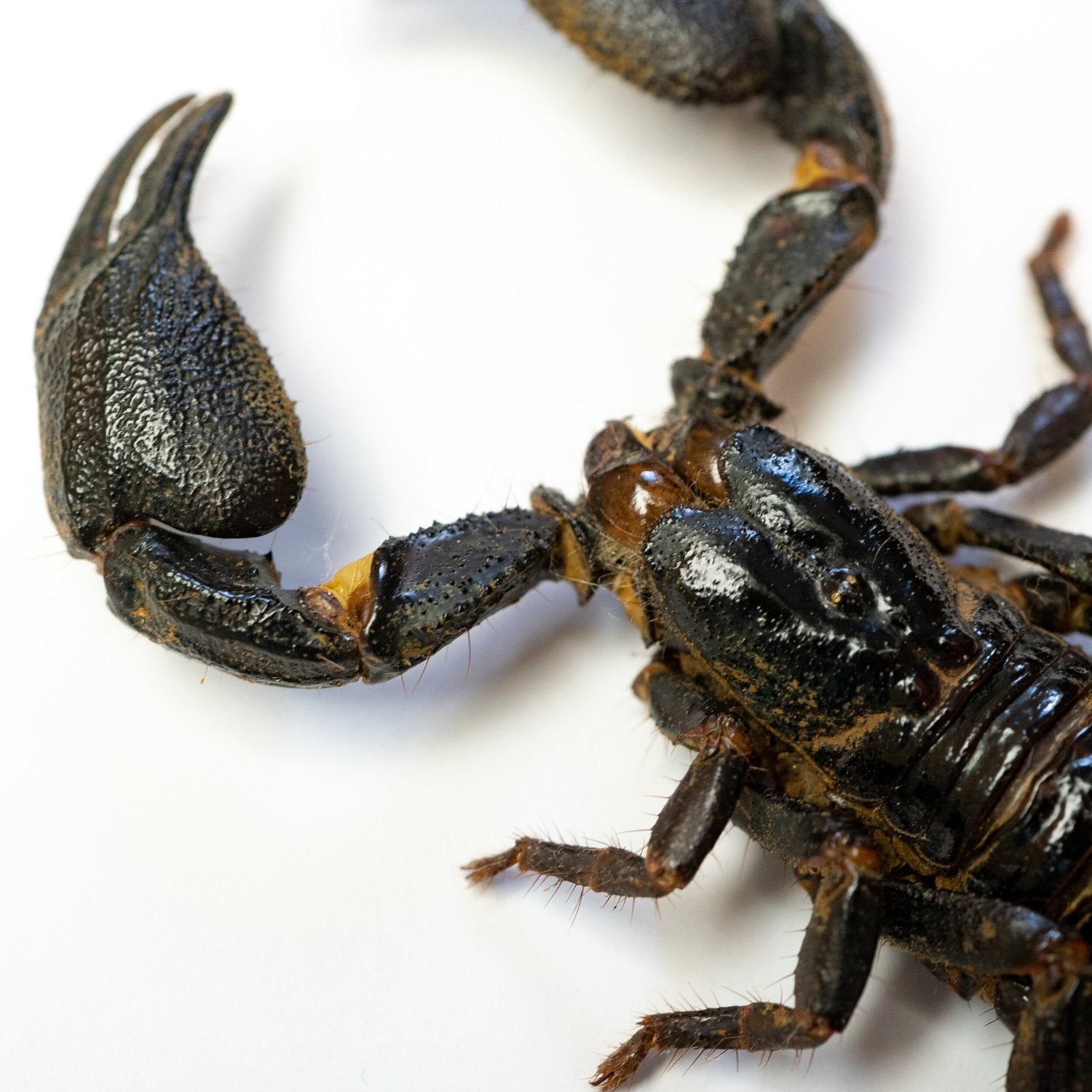 This Giant Forest Scorpion (Heterometrus swammerdami) has been hand set by our expert entomologists in our studio and elegantly mounted in a museum quality deep box frame.