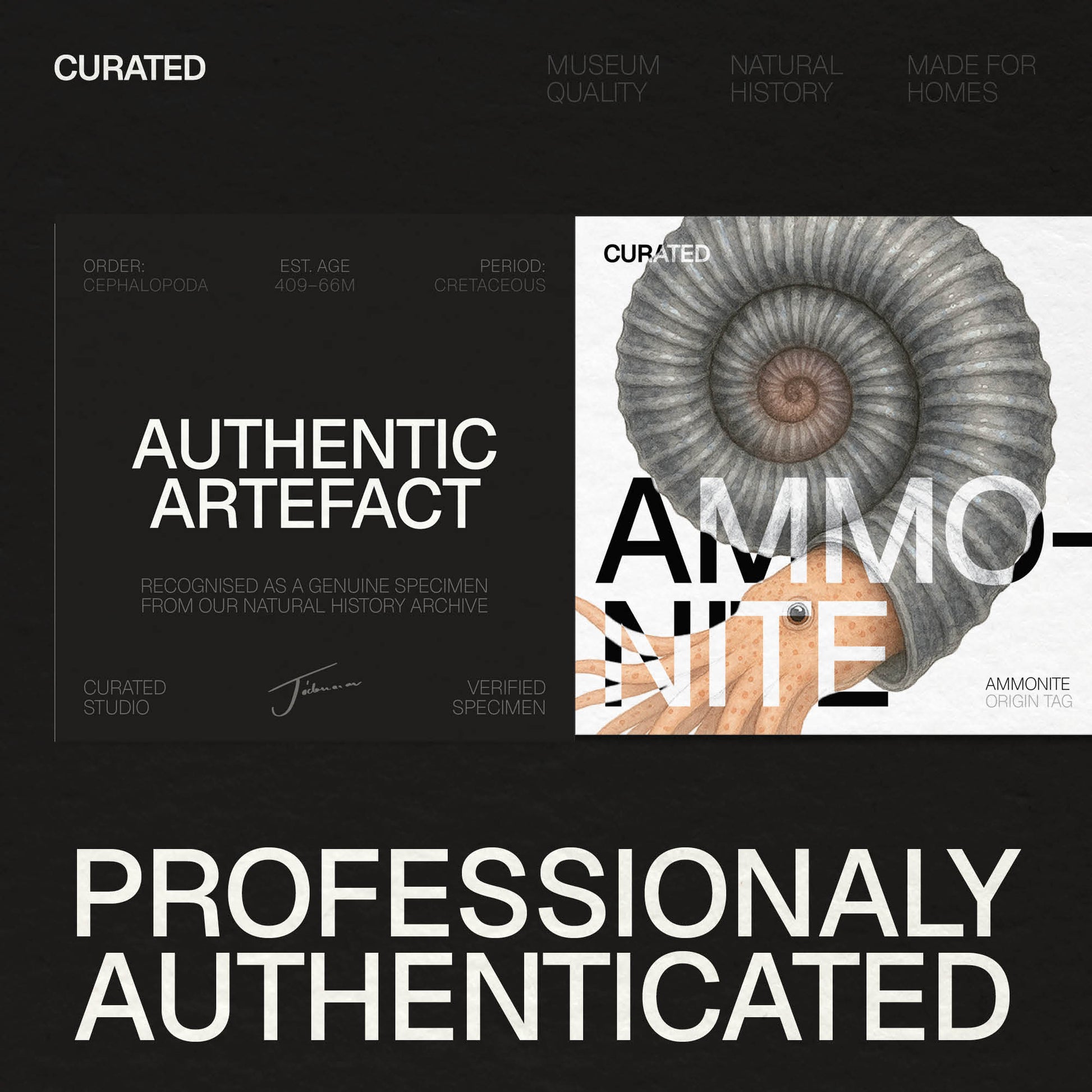 This fossilised ammonite shell belonged to a Goniatite, an extinct group of marine molluscs that lived during the Palaeozoic period, approximately 350 million years ago. Displayed on a bespoke oak stand, the specimen highlights the ancient geometry of one of Earth’s earliest coiled cephalopods.