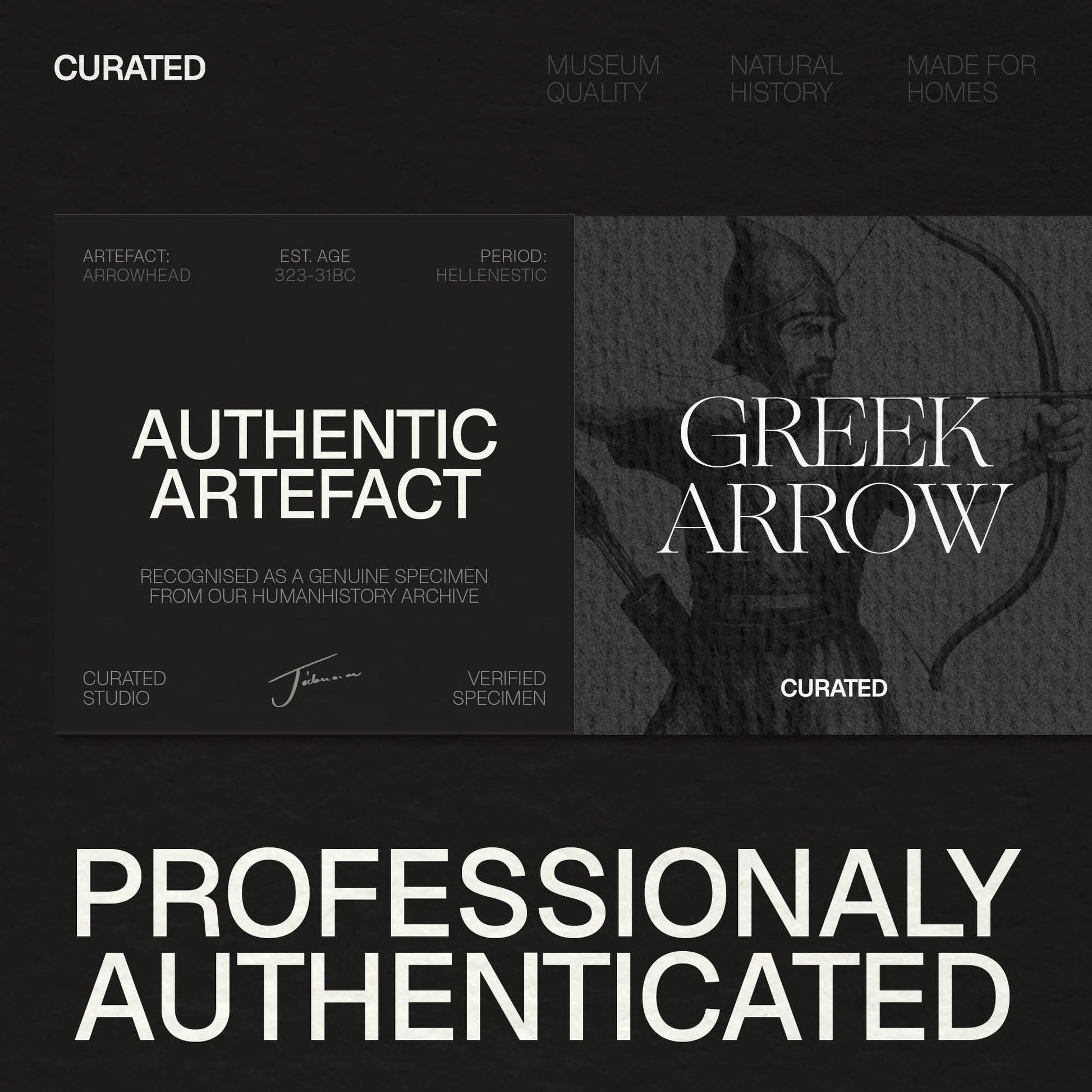 The arrow was an iron, socketed war point used across the Classical and Hellenistic periods. Typically leaf-shaped or barbed, crafted for reliable penetration in phalanx warfare and skirmishing, reflecting Greece’s refined military archery tradition.