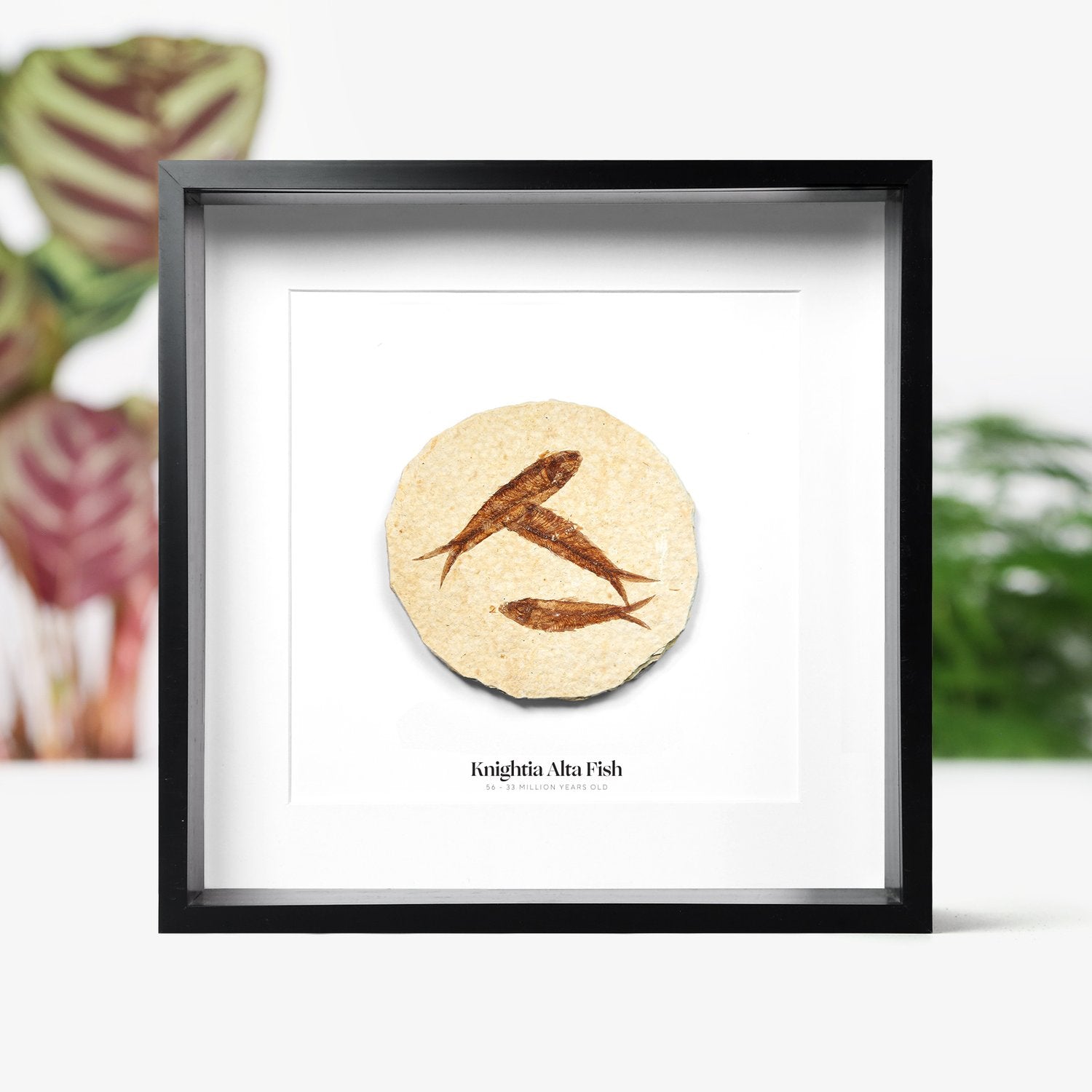 This fossil preserves a complete specimen of Knightia Alta, a small schooling fish that lived in the freshwater lakes of what is now North America during the Eocene epoch, around 50 million years ago. Displayed in a museum quality deep box frame.
