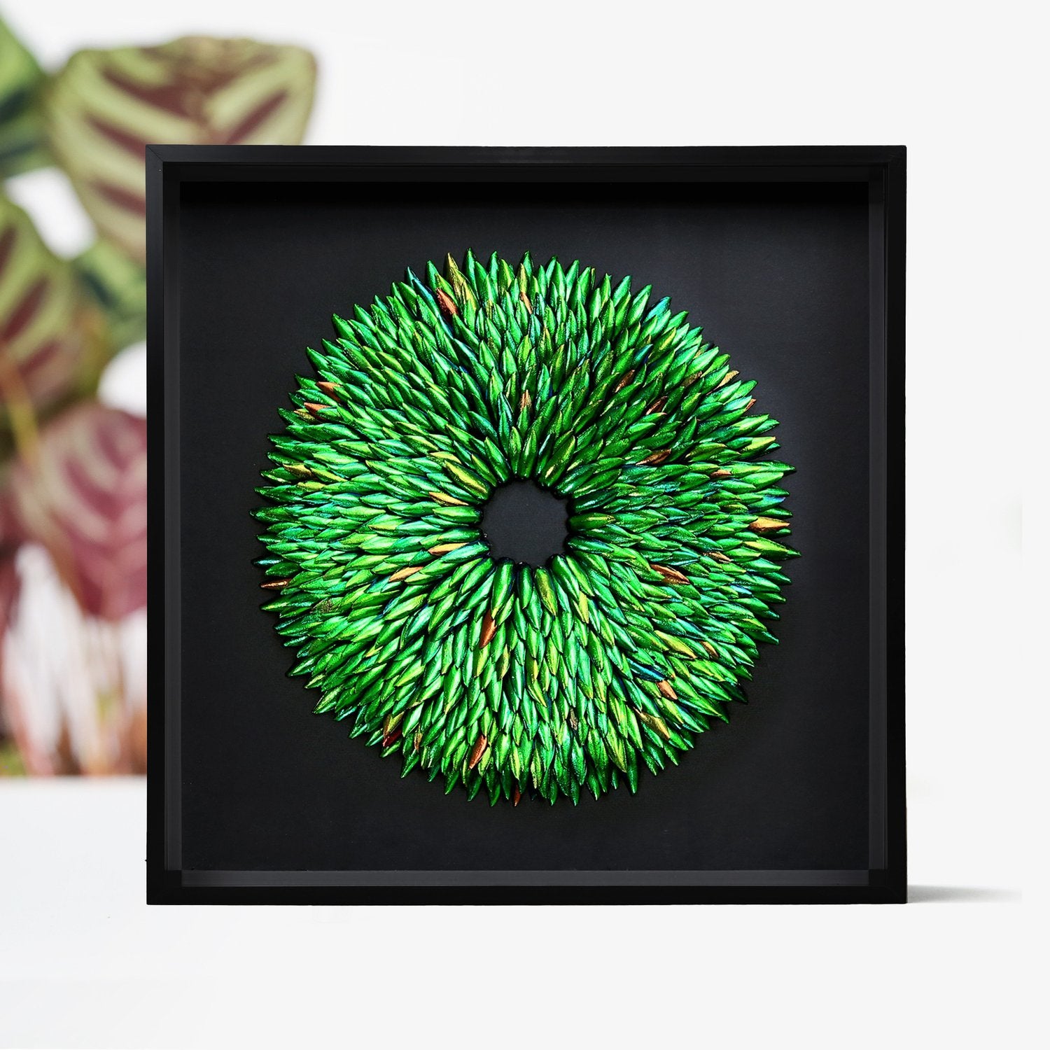 This Large Elytra Beetle Wing Mosaic has been hand set by our expert entomologists in our studio and elegantly mounted in a museum quality deep box frame.