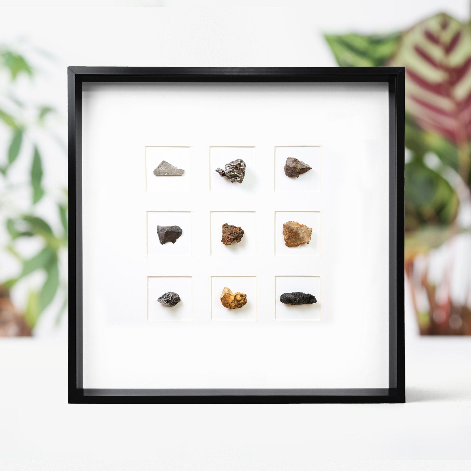 This curated collection brings together nine authentic meteorite specimens, each displayed in a museum quality deep box frame. Each specimen has been sourced from a different fall or find, and each dating back approximately 4.5 billion years.