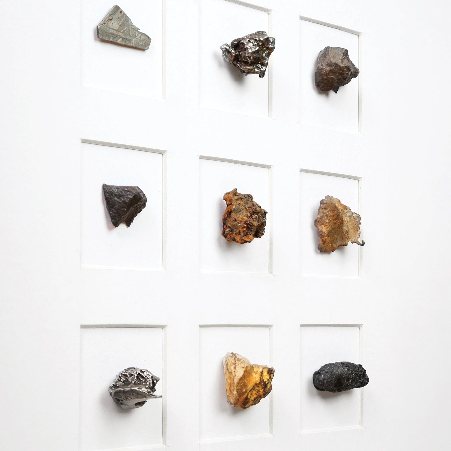 Each specimen has been individually cleaned, stabilised, and arranged to highlight its distinct composition and structure, together offering a physical cross-section of planetary debris that once moved freely through the early solar system.