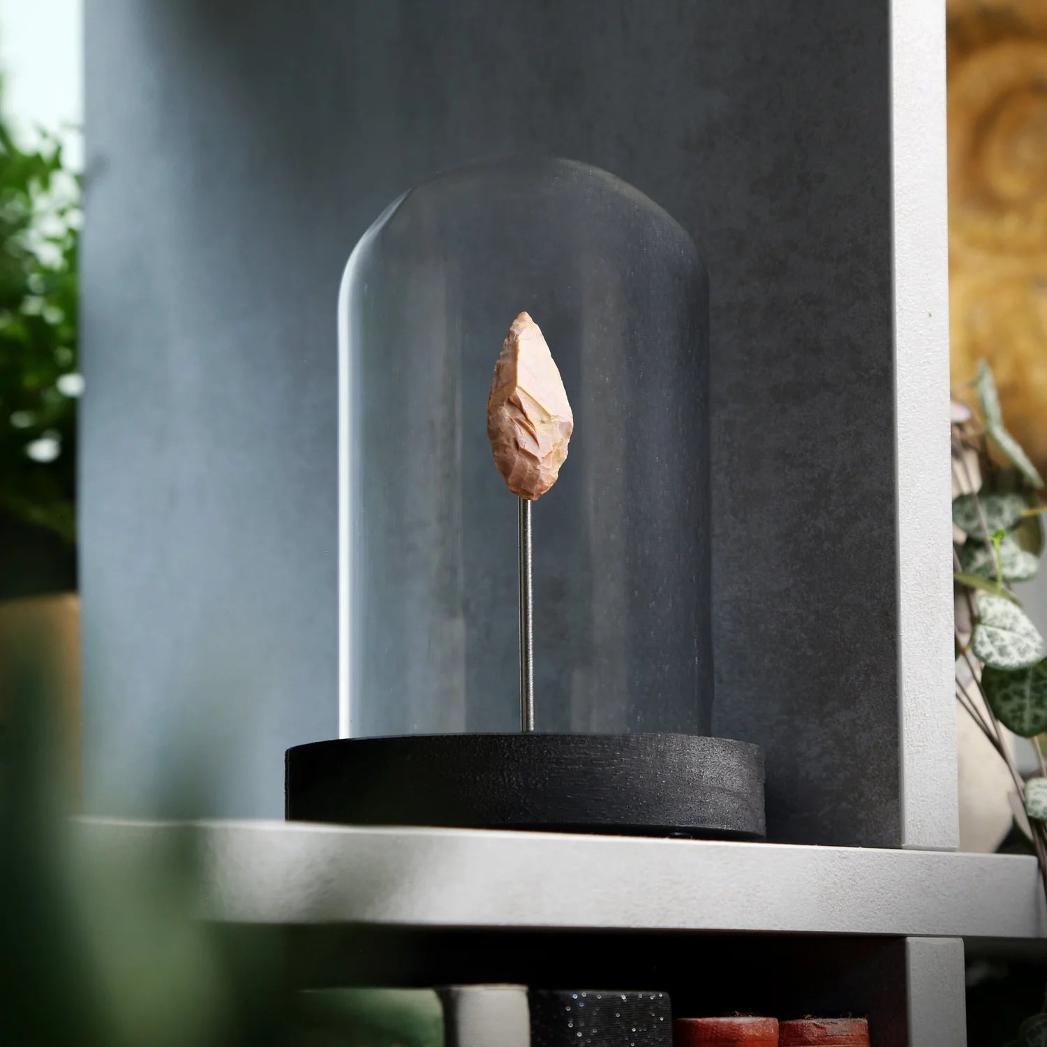 This finely crafted leaf-shaped arrowhead has been displayed in a glass dome bell jar and dates to the Neolithic period, approximately 6,000 years ago. Made from flint using skilled pressure-flaking techniques, the piece reflects the early development of human tool-making and the transition from nomadic hunting to settled agricultural life.