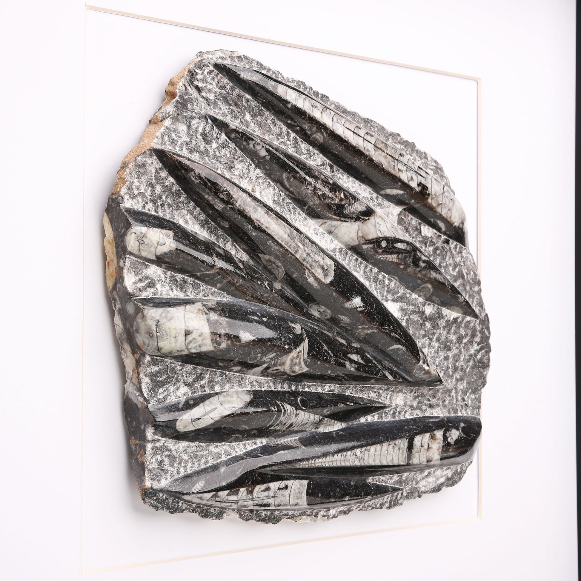 This specimen is a fossilised Orthoceras, an extinct marine cephalopod that lived during the Ordovician period, over 400 million years ago. Displayed in a museum quality deep box frame.
