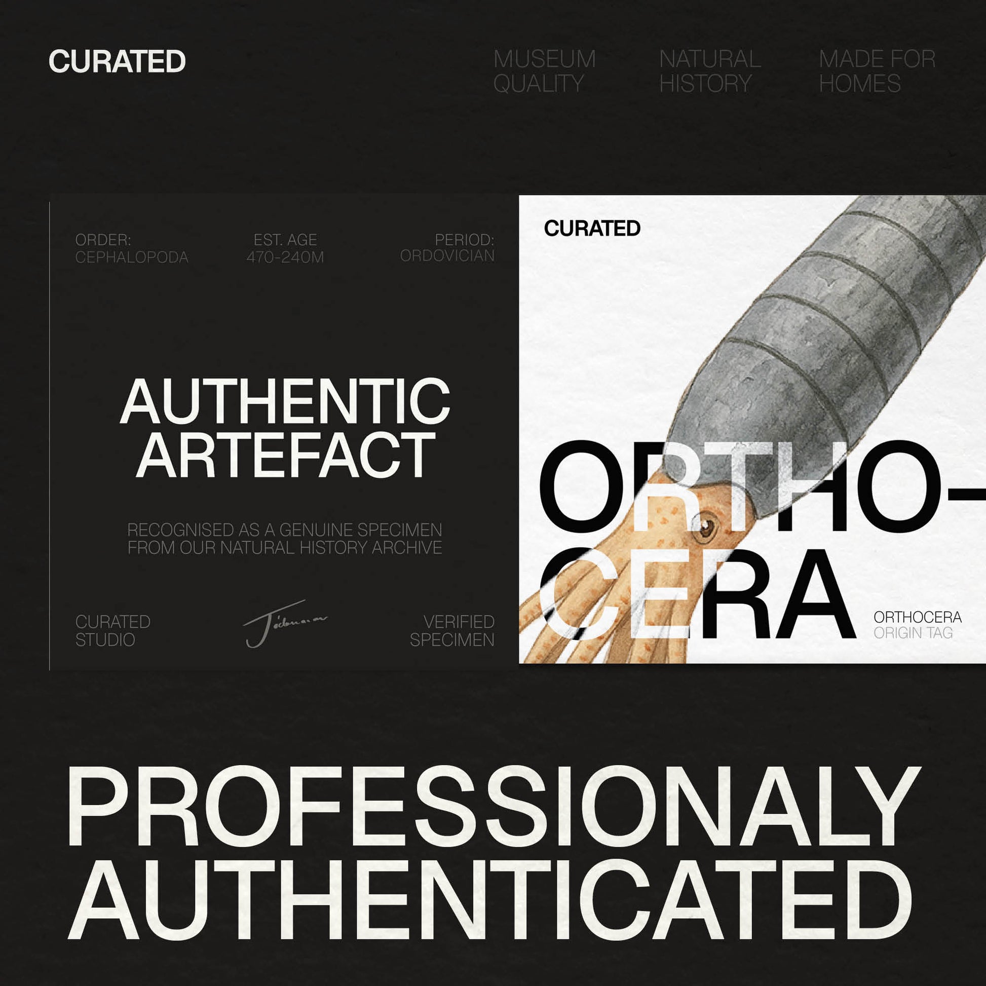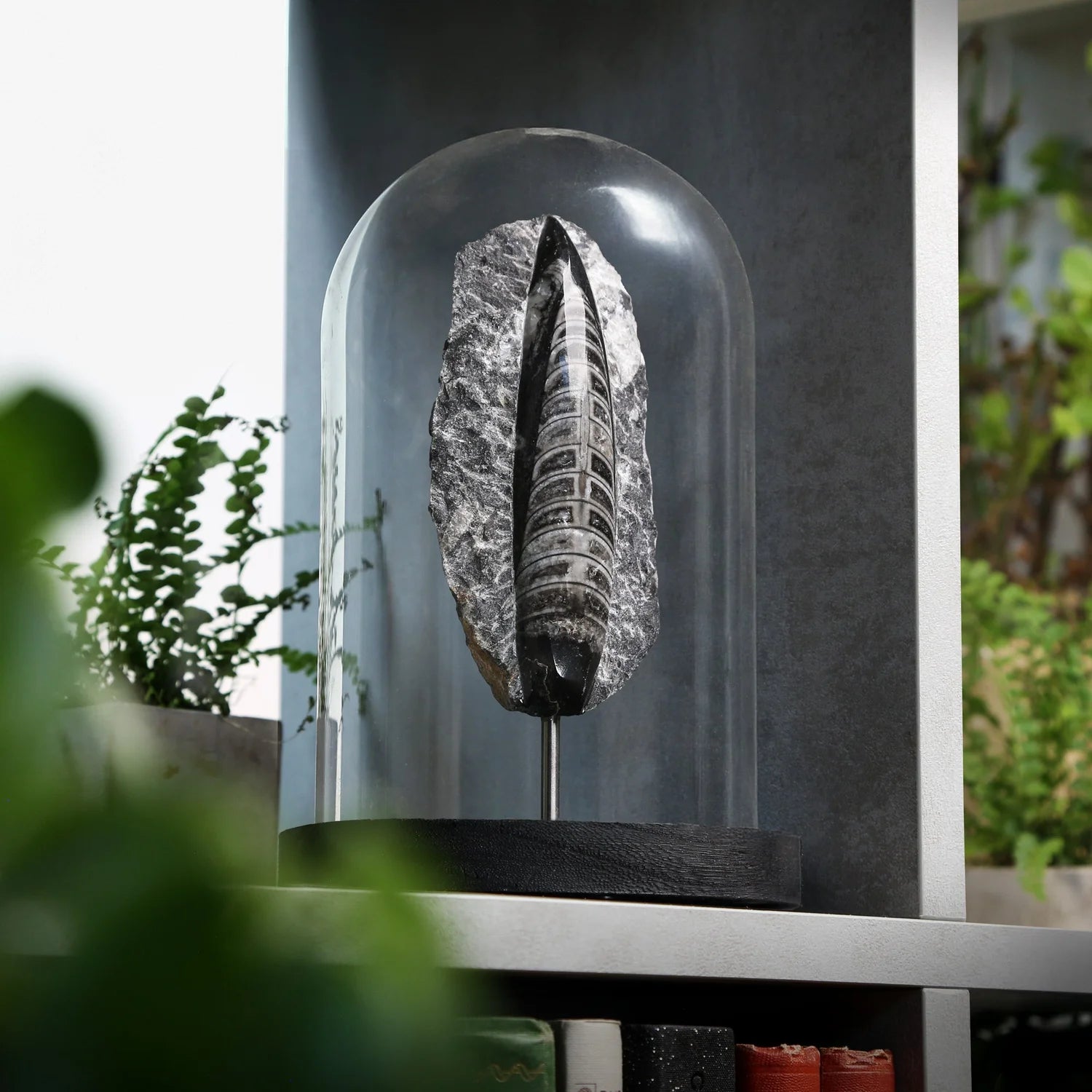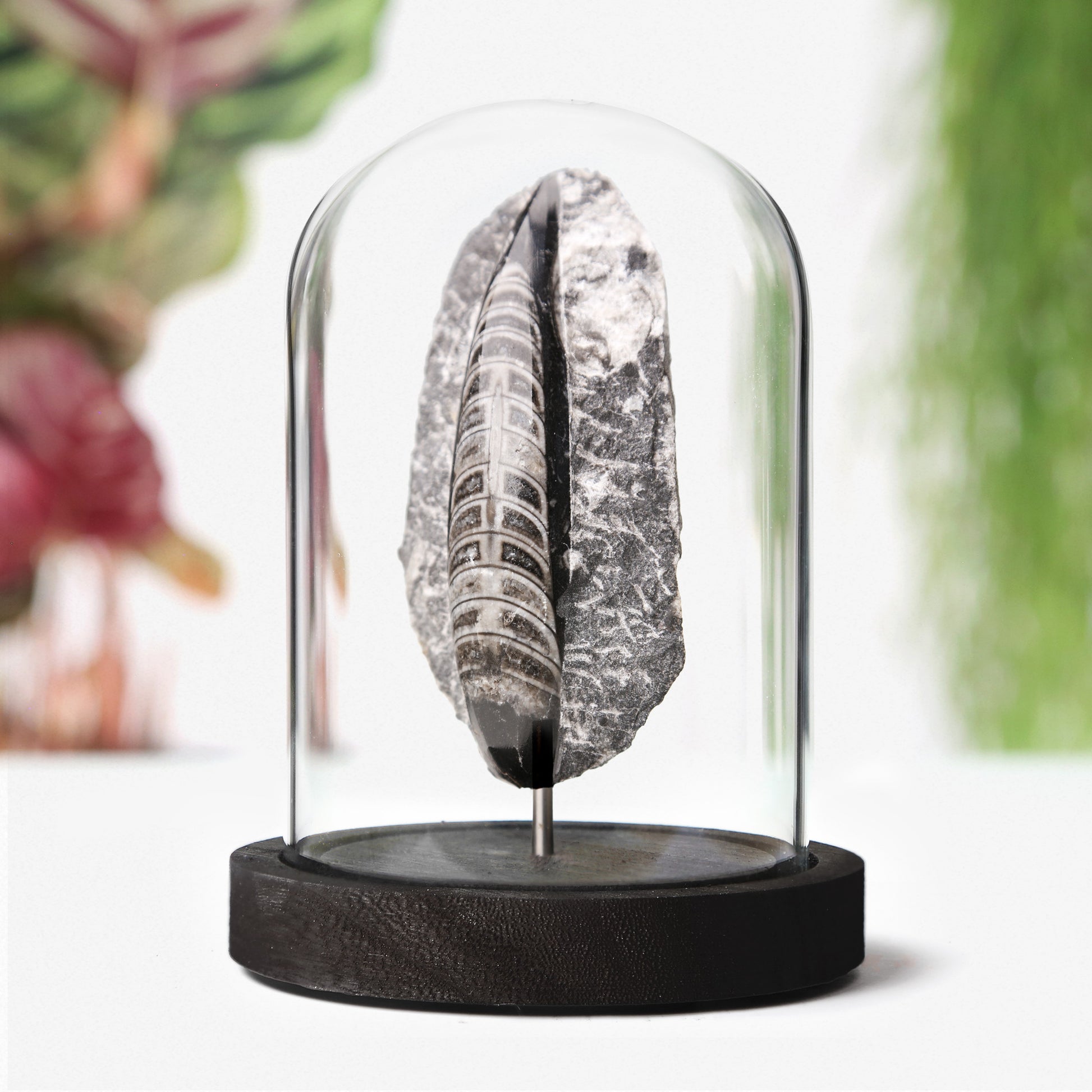 This specimen is a fossilised Orthoceras, an extinct marine cephalopod that lived during the Ordovician period, over 400 million years ago. Displayed in a museum quality glass dome bell jar