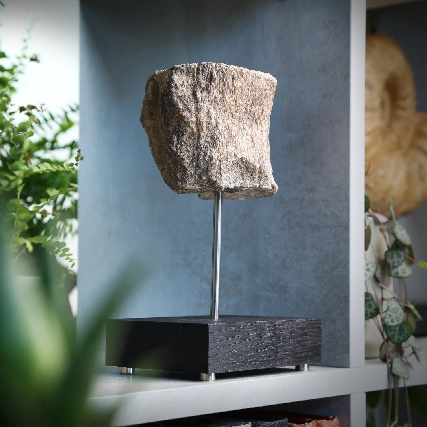 This fossilised Plesiosaur bone has been mounted on a bespoke wooden base stand. Dating to the Late Jurassic to Early Cretaceous period, around 150 to 100 million years ago, it belonged to one of the most iconic marine reptiles of the Mesozoic seas.