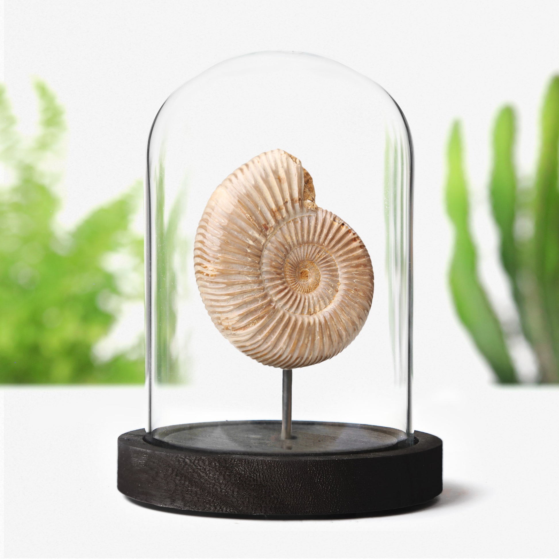This fossilised ammonite is preserved in limestone and dates to the Jurassic period, approximately 180 million years ago and has been displayed in museum quality glass dome bell jar.