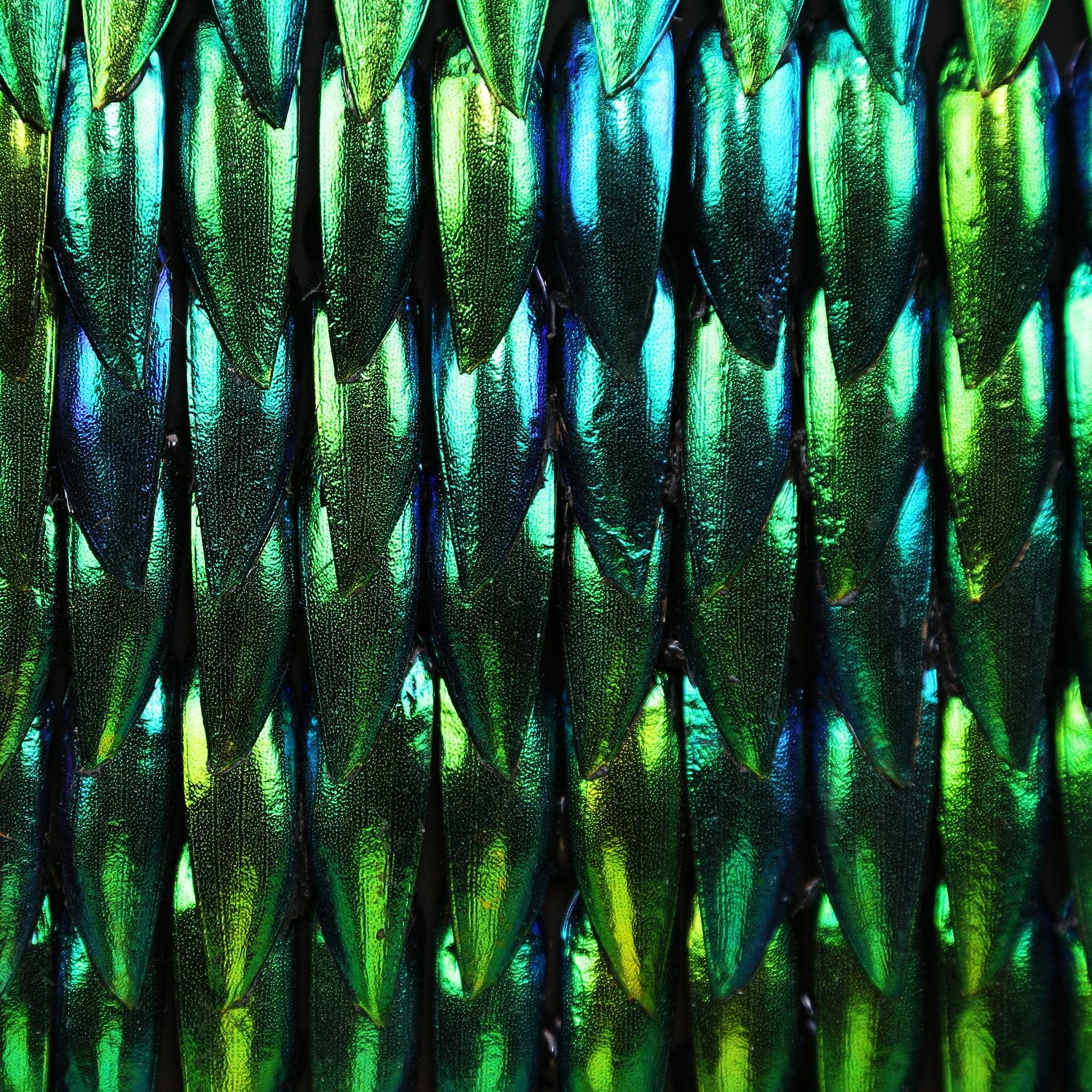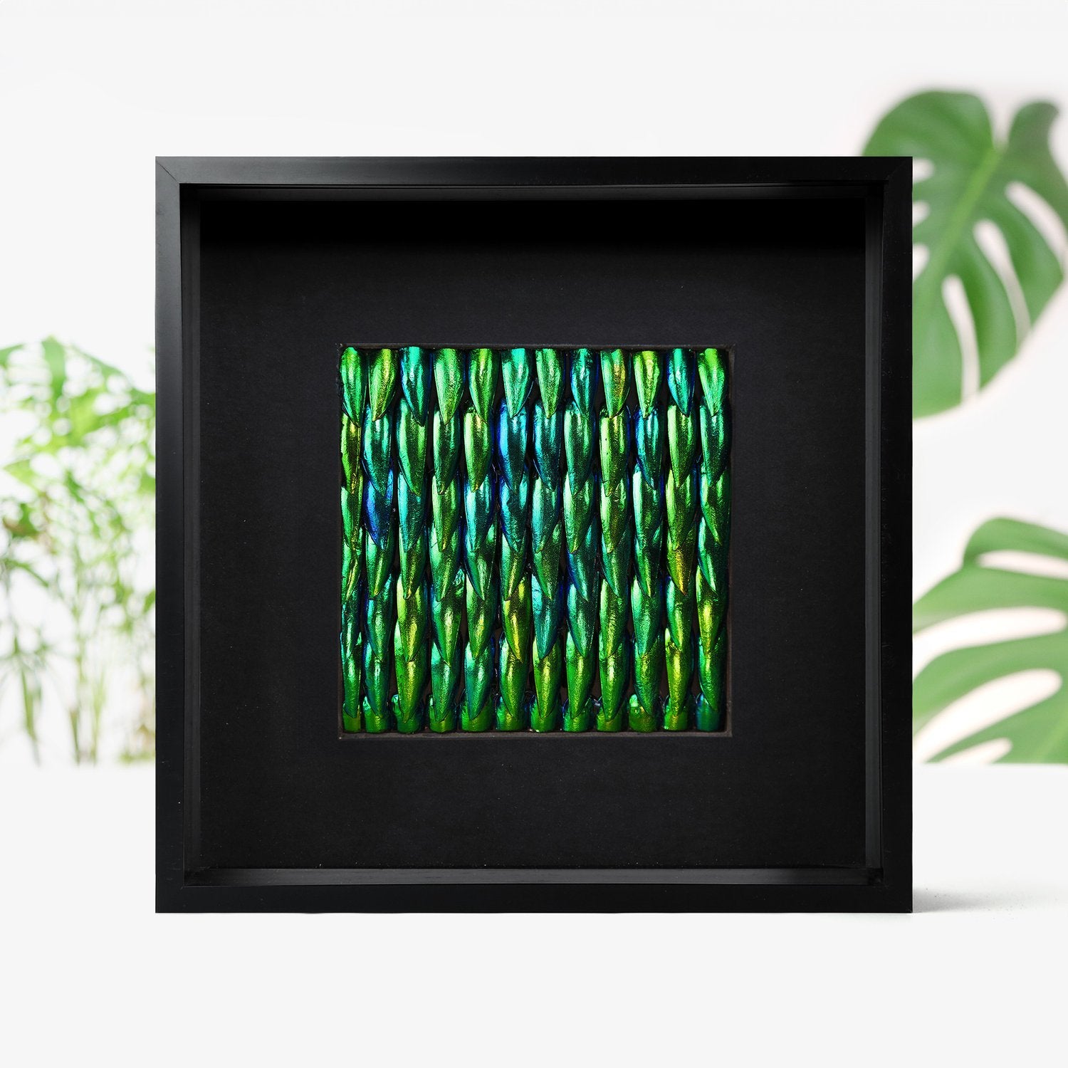 This Elytra Beetle Wing Mosaic has been hand set by our expert entomologists in our studio and elegantly mounted in a museum quality deep box frame.