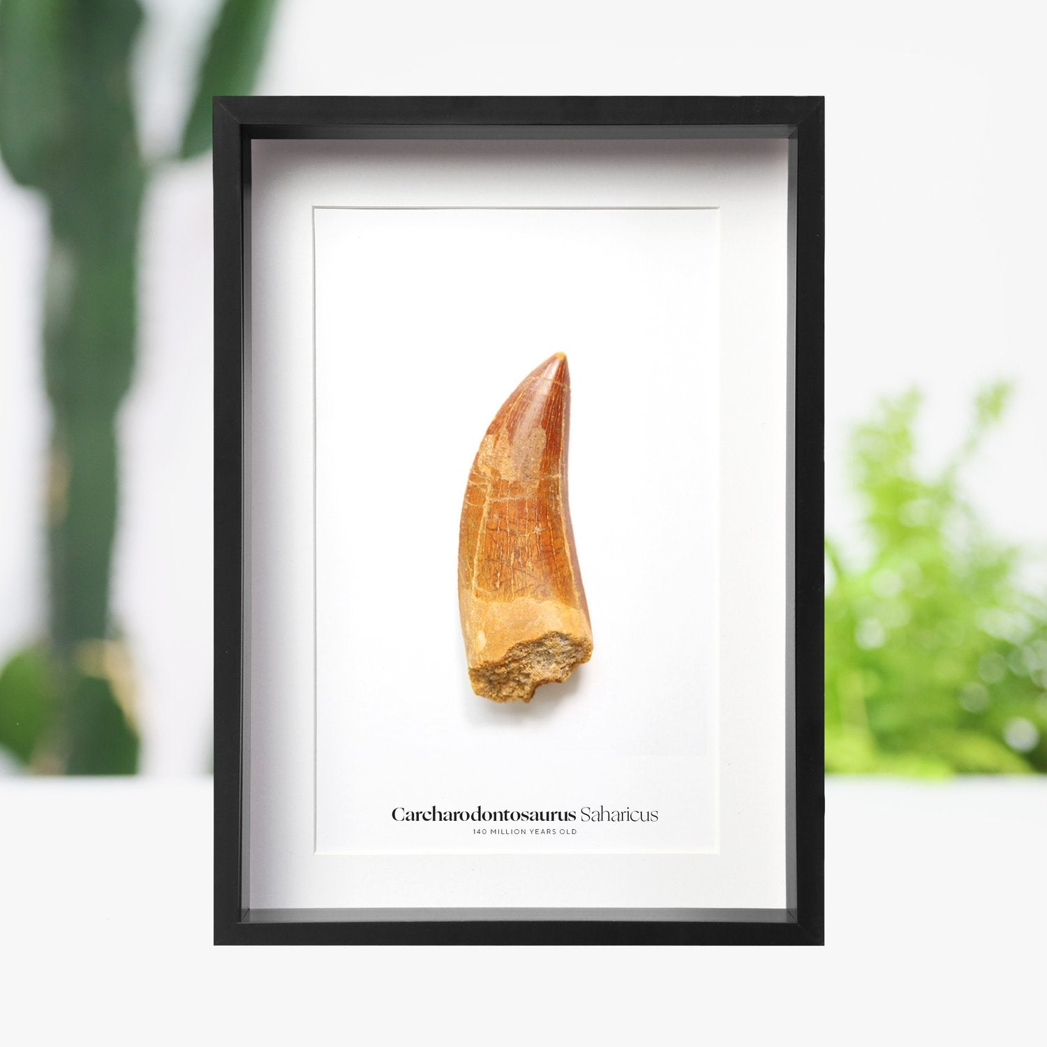 This African Carcharodontosaurus Tooth (140 Million Years Old) has been displayed and elegantly mounted in a museum quality deep box frame, by our expert in house team.